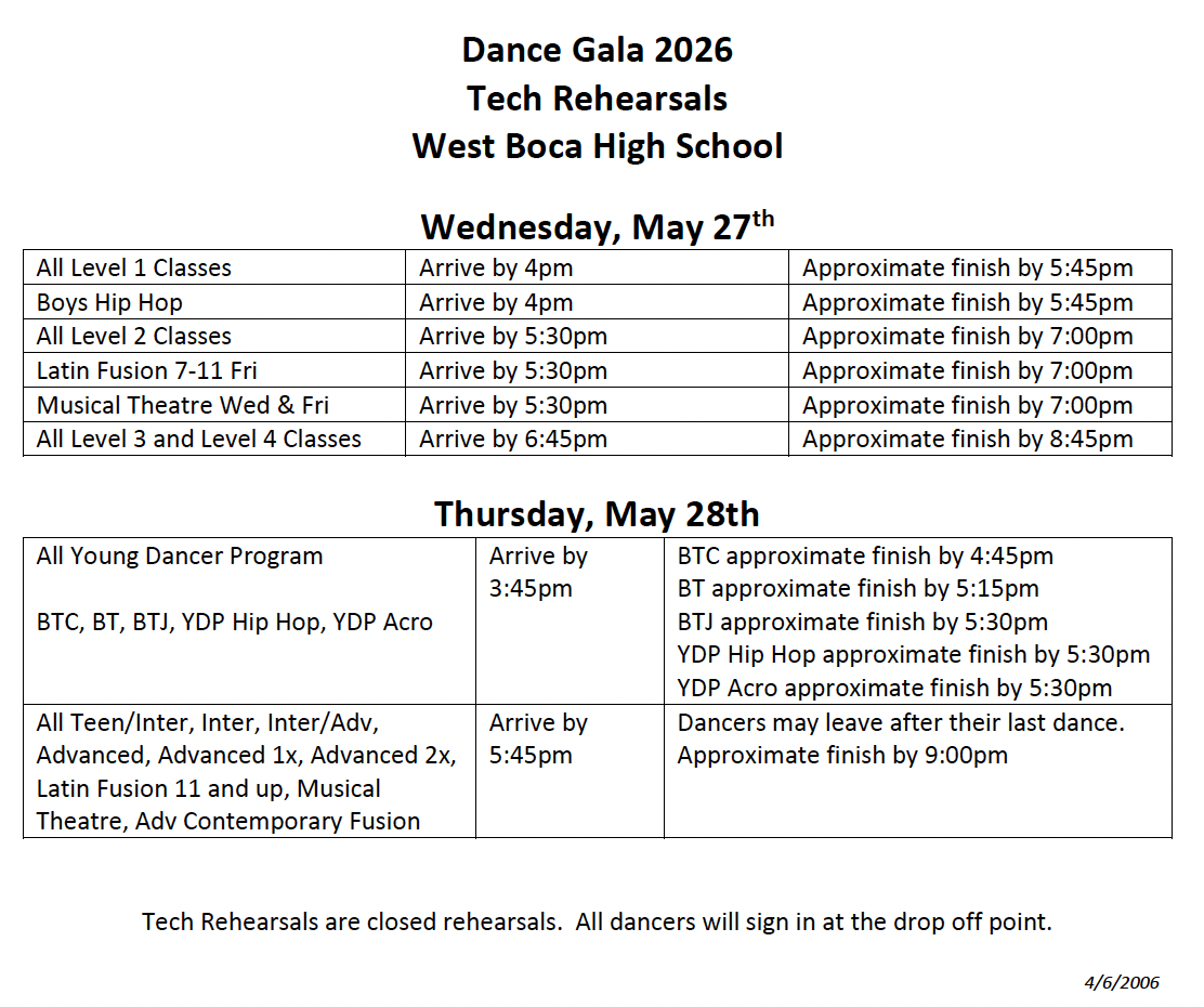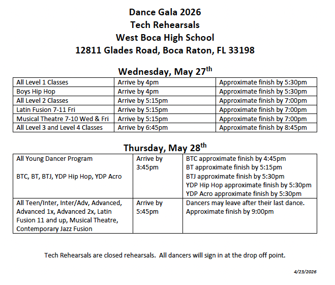 9. When and where is the tech rehearsal? Tech rehearsal for our Young Dancer Program is scheduled for Thursday, May 30th at 4pm. Parents should plan to arrive by 3:45pm to ensure they have enough time to check their dancer in. Tech rehearsal is held at West Boca High School. Address to West Boca High School: 12811 Glades Rd, Boca Raton, FL 33498